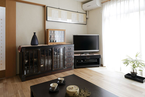 装饰Tips:黑色的木质茶几,方方正正的样式,节约了空间,搭配木色的地板,非常协调。茶几上传统的日式餐具,令整体的日式气息弥漫。深蓝色的坐垫,圆滑线条图案的装饰,淡雅感十足。
