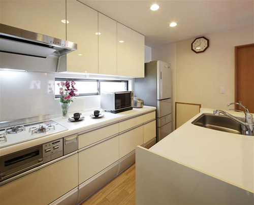 装饰Tips:厨房区域,乳白色的整体墙柜和橱柜,干净整洁。再搭配纯白色的墙壁,令厨房区域宽敞明亮。一盆盛开的粉色的鲜花,透明的花盆,绿叶点缀,生活的淡雅之情无处不在。