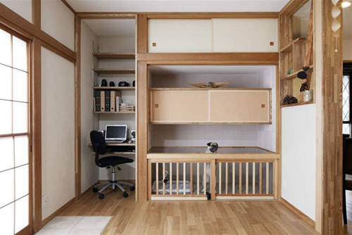 装饰Tips:淡木色拉门样式的柜子,可以用作存放狗狗物品的收纳柜,方便整洁。旁边的小空间,木板打造的分层书柜,摆放上各种书籍,方便主人拿取。
