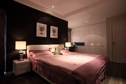 卧室装修效果图选择的色彩稍微偏向玫瑰红色,因为黄色使人神经兴奋,不利于睡眠。而且深红玫瑰红色还能增加浪漫的气氛。射灯的巧妙安放展现了魅惑的效果。