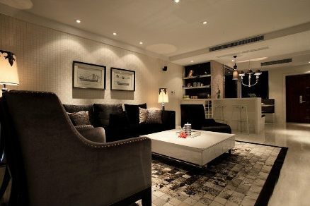 沙发背景墙采用同黄色的墙壁,黑色的沙发颜色来保持客厅装修颜色的统一不多的射灯创造出漂亮的光影效果。使用瓷砖做出抽象画地毯的效果,给人以高雅。