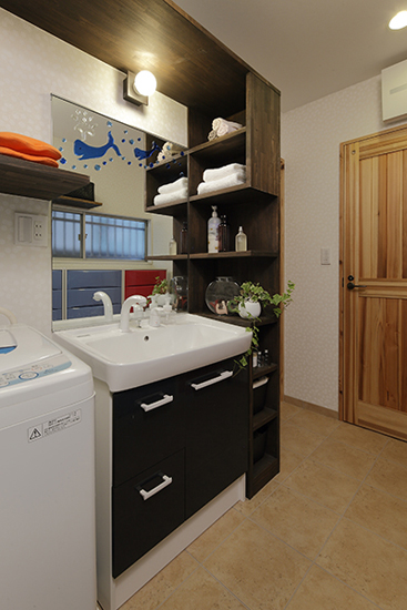 装修TIPS:分层式的木质收纳柜,可以放上毛巾等洗澡用品,非常实用。洗脸台下方的拉式收纳柜,同样具有强大的收纳功能。长方形的镜子上,印有蓝色的小动物,俏皮可爱。