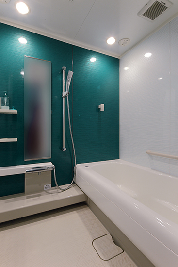 装修TIPS:蓝绿的一面墙壁,给人一种清新舒适之感。灰色的地毯,不仅具有防滑作用,还非常耐脏。长方形的镜子,起到了扩大空间的视觉效果。