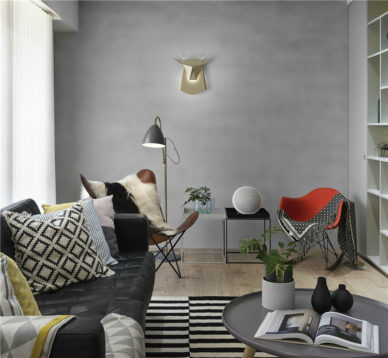 在墙角的设计是亮点,一把皮质蝴蝶椅,一把伊姆斯椅,工作之余可以在这里舒服的阅读、闲谈。墙面上金色鹿角壁灯,画龙点睛,空间更加靓丽。
