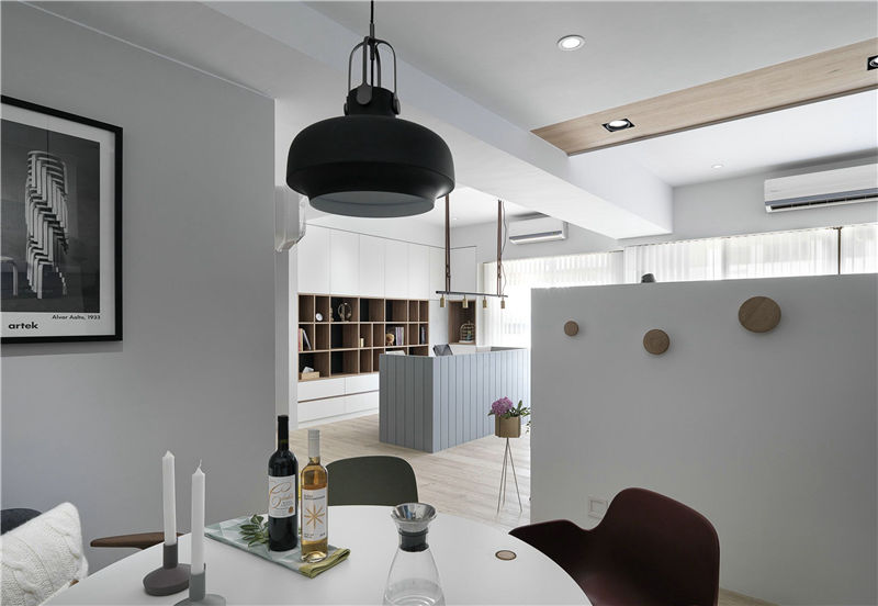 低垂射灯给工作提供充裕的照明,顶面的灯也带来洗墙的效果,不同高度的灯光设计为工作打造温馨的光环境。一黑一白的椅背,一红一黑的坐垫,通过色彩上的差异,展示男女主人不同的工作状态。